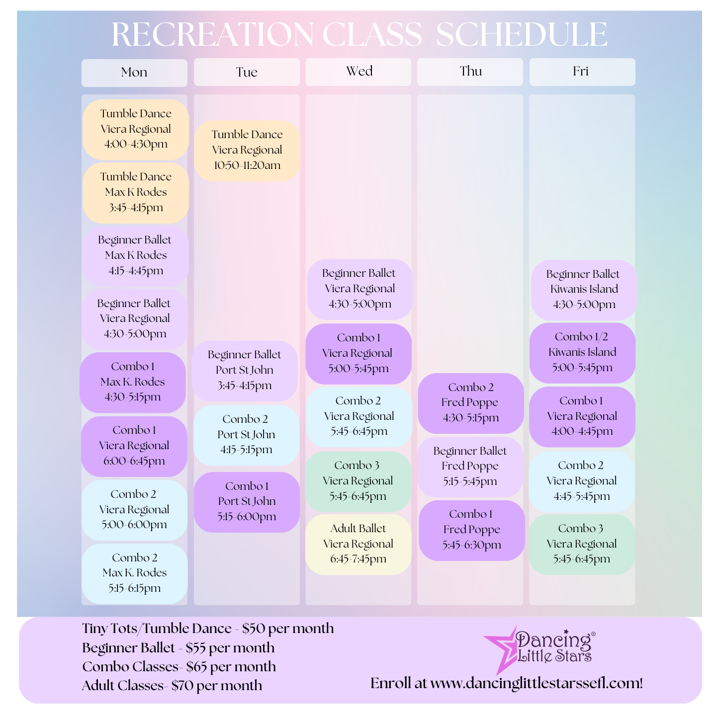 Mini Stars(ages 1-3 with parent participation): Creative Movement, Music Fundamentals, Exercise and Flexibility, Pre-Ballet